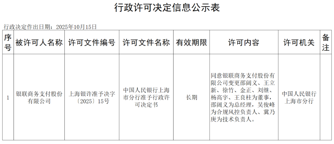 中國人民銀行上海市分行更新行政許可決定信息公示表,許可文件編號“上海銀許準予決字 〔2025〕15號”顯示,同意銀聯商務支付股份有限公司變更邵闊義、王立新、徐竹、金正、劉繼、楊高宇、王良柱為董事,邵闊義為總經理,吳俊峰為合規風控負責人、冀乃庚為技術負責人。